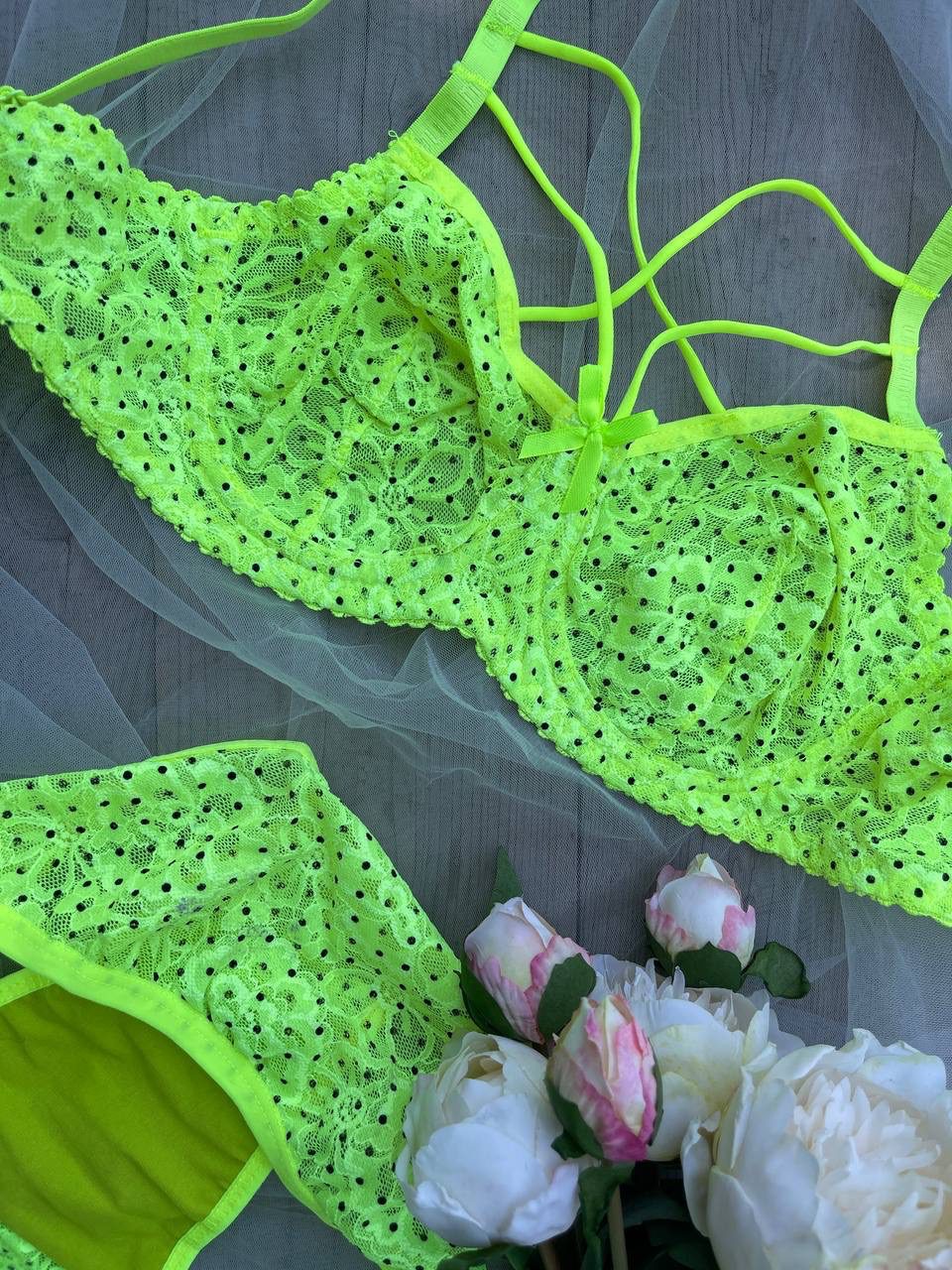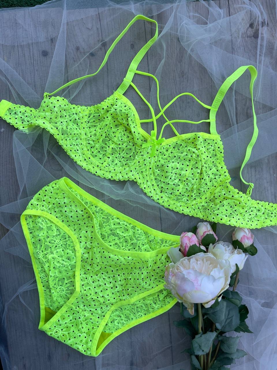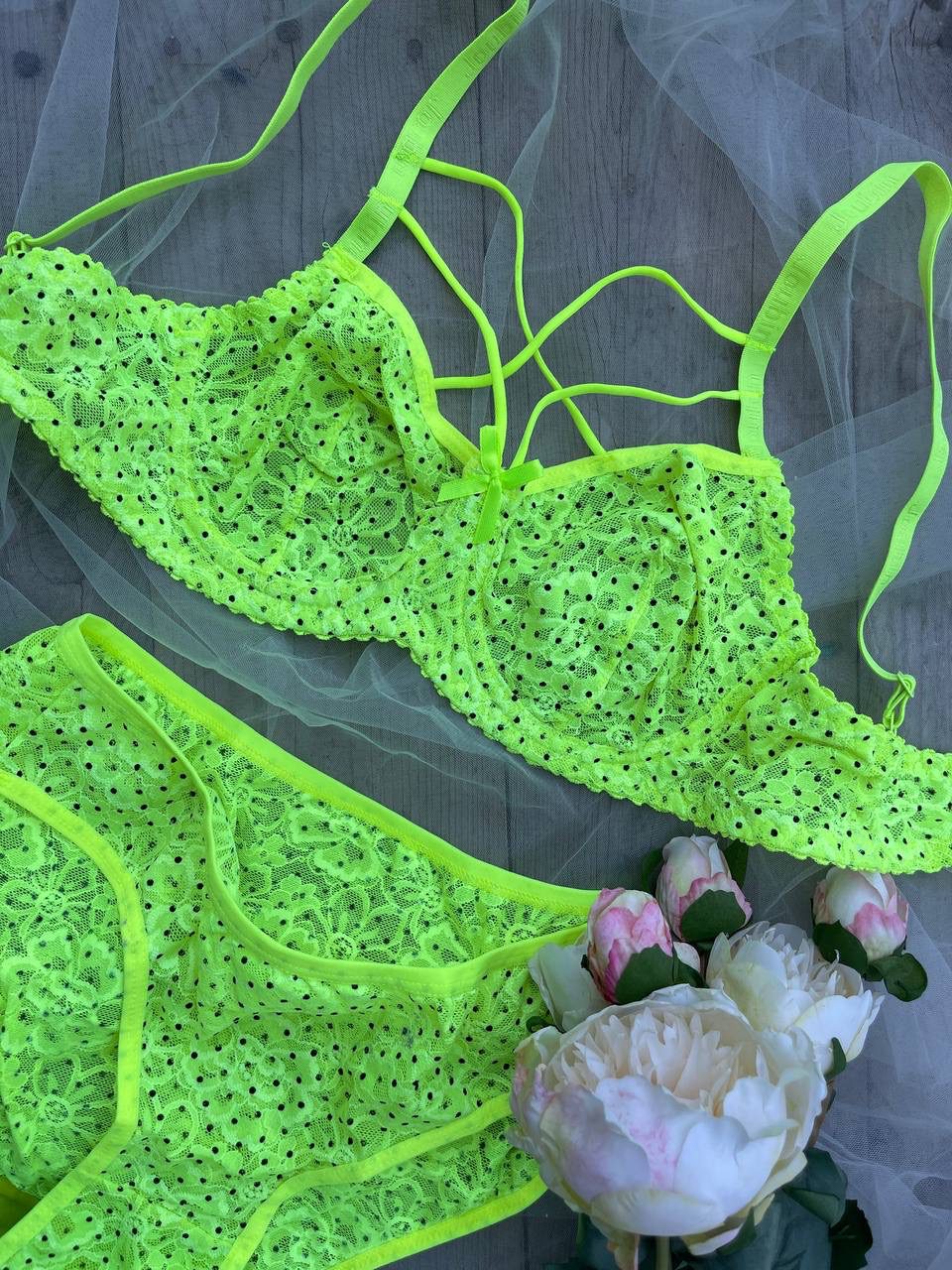 ست مسطوره رنگ فسفری شب نما داره که با ترکیب دانتل های لبه کاپ سوتین روش جلوه خیره کننده به محصول میده..
